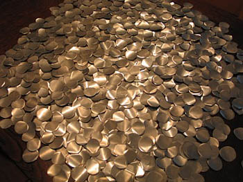 Christine has spent the last year converting beer cans into thousands of aluminum circles. In natural light, which moves and changes, the aluminum circles become discs of shimmering light, like skin, like pebbles, like water.