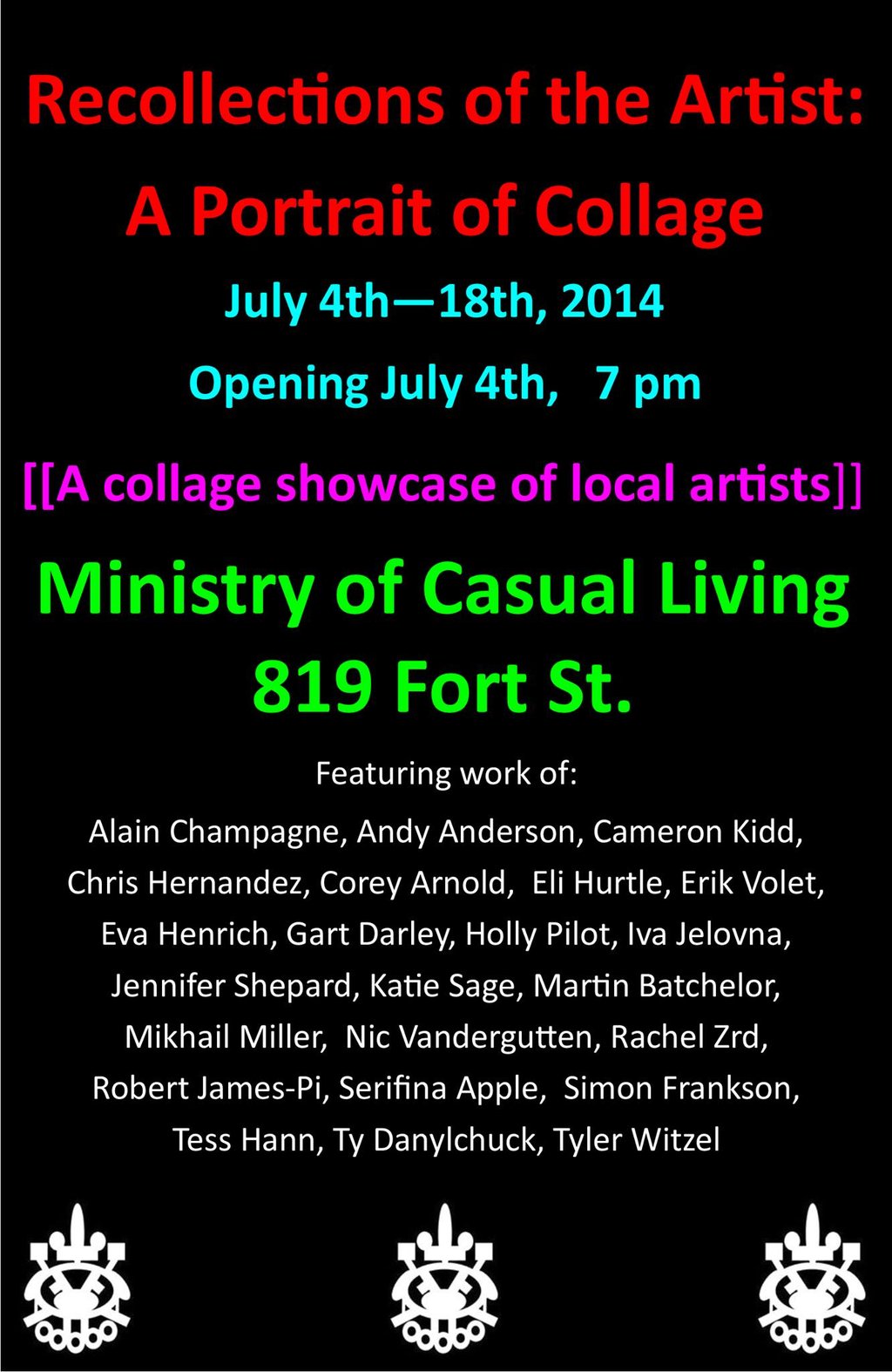 REFLECTIONS OF THE ARTIST: A PORTRAIT OF COLLAGE aims to collect and display a large selection of Victoria’s own unique COLLAGE artists into one congregated showing // connecting and assembling different forms of collage together // resulting in an art show that will resemble the same art work being presented // A COLLAGE PORTRAIT OF COLLAGE