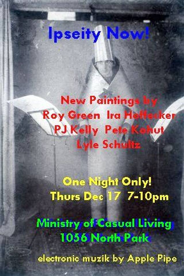 Ipseity Now is an exhibit of 4 Victoria painters-Roy Green, Ira Hoffecker, PJ Kelly and Pete Kohut. This exhibit explores identity, whether it be the depiction of personal mementos, historical sites, media images or the images that are layered, submerged or regenerated by the daily ritual of the painting process. Chromatic exuberance is a common theme as the intense and often odd colors these painters employ cajole and confound expectations. There will be a short electronic music performance by Apple Pipe at 8 pm.