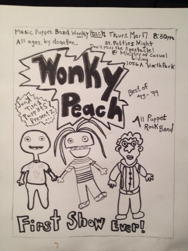 Junktime Puppets and VH1 present you with the original puppet band Wonky Peach. A look into the band from '93-'99. Where they started, how it ended, who hooked up, and who fell off the wagon.... Ever wonder where "I don't like men, but I like girls now" came from? Here the story, hear them live, and hear the musical thrash and crash and womble domble of the instuments. tonight Debut show St.Patties Night