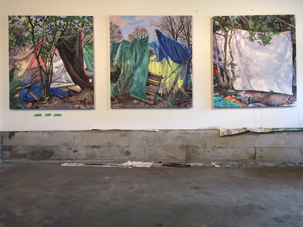 I am interested in spaces where human and non human elements coalesce and describe a social situation. The "Tent City" here in Victoria is nothing if not descriptive, and in this work I have attempted to paint the textures of cloth, sticks, soil, foliage and ephemera... There are many reasons why people have ended up on the margins of society and there are many opinions about them too. These paintings are not opinion pieces, they are meant to be descriptive and beautiful. I hope the viewer may delight in the colours and textures of these paintings and feel unsettled about it. This triptych will be shown in sequence, one at a time here in the Odeon Alley Window over the course of three weeks.