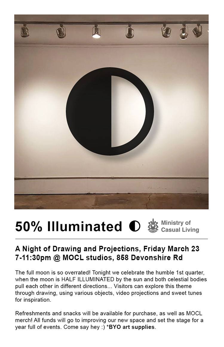 The full moon is so overrated! Tonight we celebrate the humble 1st quarter, when the moon is HALF ILLUMINATED by the sun and both celestial bodies pull each other in different directions ...... Visitors can explore this theme through drawing, using various objects, video projections and sweet tunes for inspiration.