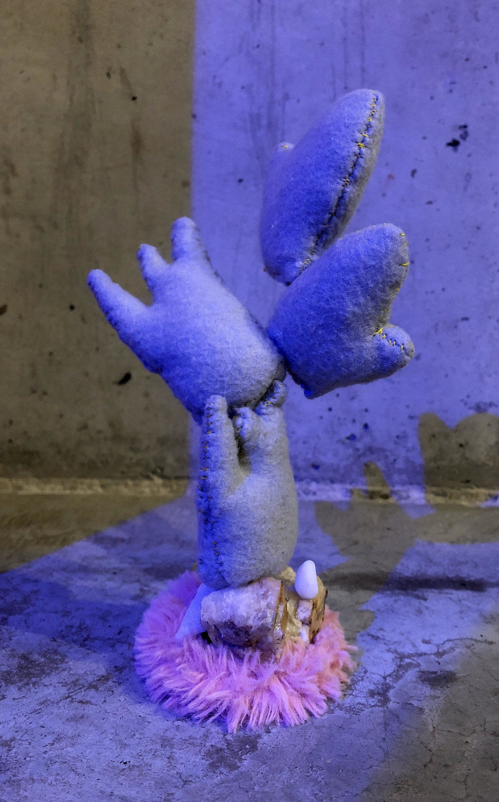 Laughing on the Inside is a multidisciplinary installation coming from the proposition of having punchlines without jokes. Would these one liners remain funny? What stories can be conjured up from an isolated quip? This work explores different forms of comedy in relation to lineage as a way to time travel (such as stealing your grandma's joke, but confusing the details). This thinking was developed over the summer of 2018, during an experimental field school residency on the Gaspé Peninsula, which also happens to be the region the artist’s family inhabited for centuries. Going with the intention of communicating with rocks, McInnis instead turned away from the coast and towards the architecture of churches and farmhouses. This brought forth insights of deep time, genetic memory of space, and the cosmic joke. By employing the architecture of the gallery to physically create the work in this exhibition, the artist presents situational comedy.