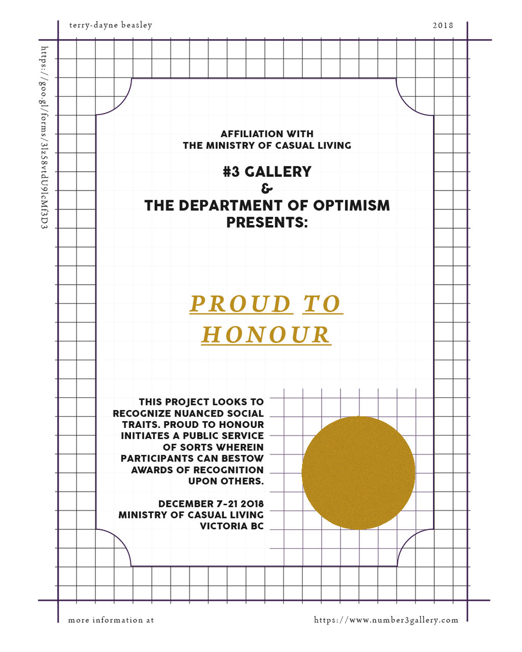 Using the Ministry of Casual Living as institution through which awards will be issued, Proud To Honour initiates a public service of sorts wherein participants can bestow awards of recognition upon others. Prior to and for the final instalment of the exhibition, Beasley relies on the public to facilitate both the granting process and to provide the necessary information to generate such awards.
