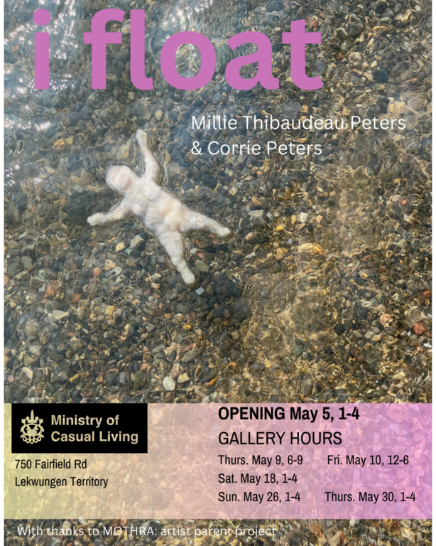 Join us in welcoming Millie Thibaudeau Peters & Corrie Peters to The Ministry of Casual Living Hallway Gallery. ‘i float’ opens this Sunday, May 5th, from 1-4PM!