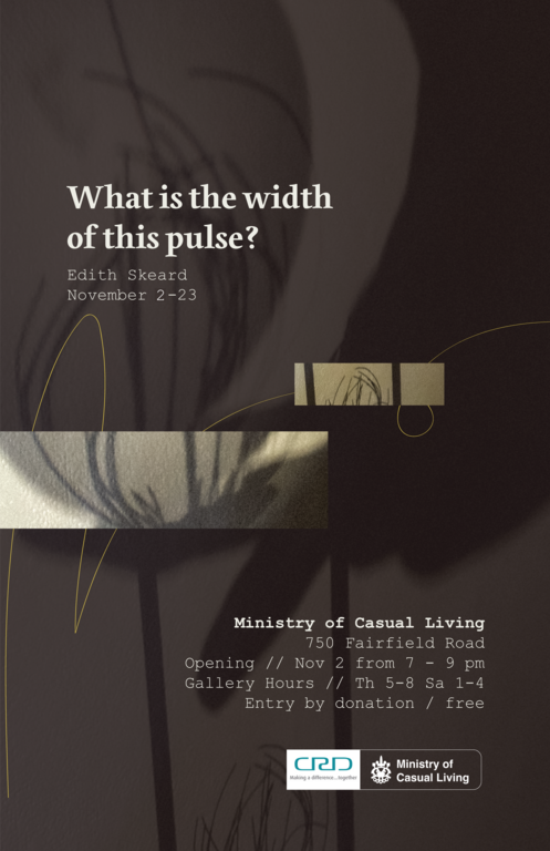 Thursdays: 5-8PM, Saturdays: 1-4PM Join us in celebrating artist Edith Skeard's exhibition opening of 'What is the width of this pulse?' Opening November 2nd, from 7-9PM at The Ministry of Casual Living Window Gallery. 750 Fairfield Road.