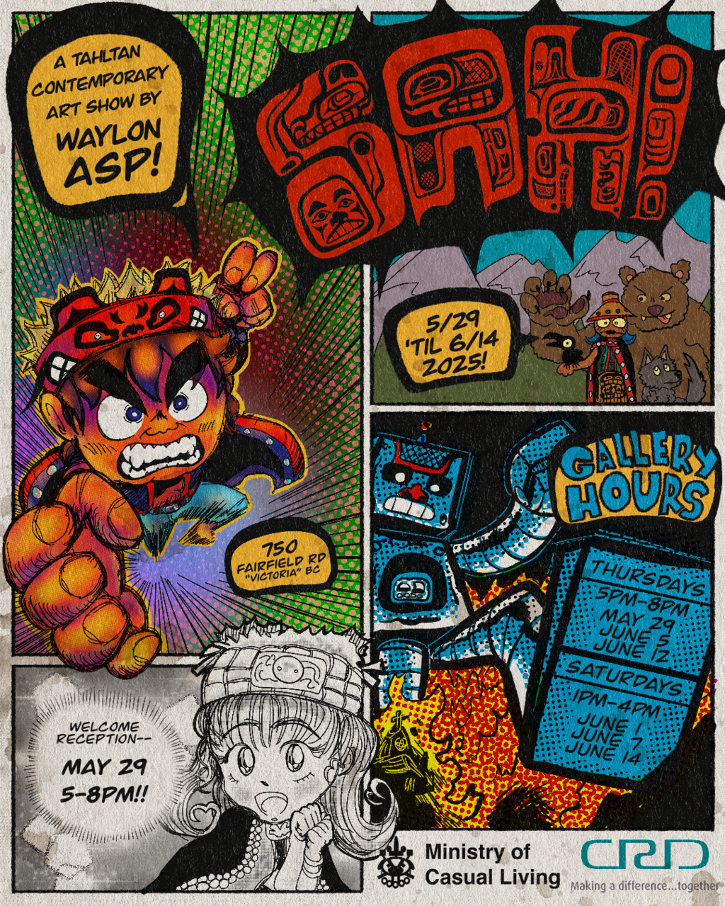 Saturdays: 1-4PM “Sah!” — the solo exhibition debut of Tahltan artist Waylon Asp will be on display at the @ministryofcasualliving — FREE entry (or by donation) and open to the public starting May 29th 2025!! The gallery, located at 750 Fairfield Road, will be open Thursdays from 5-8pm and Saturdays from 1-4 until June 14th. Paintings, illustrations, and more will be for sale.