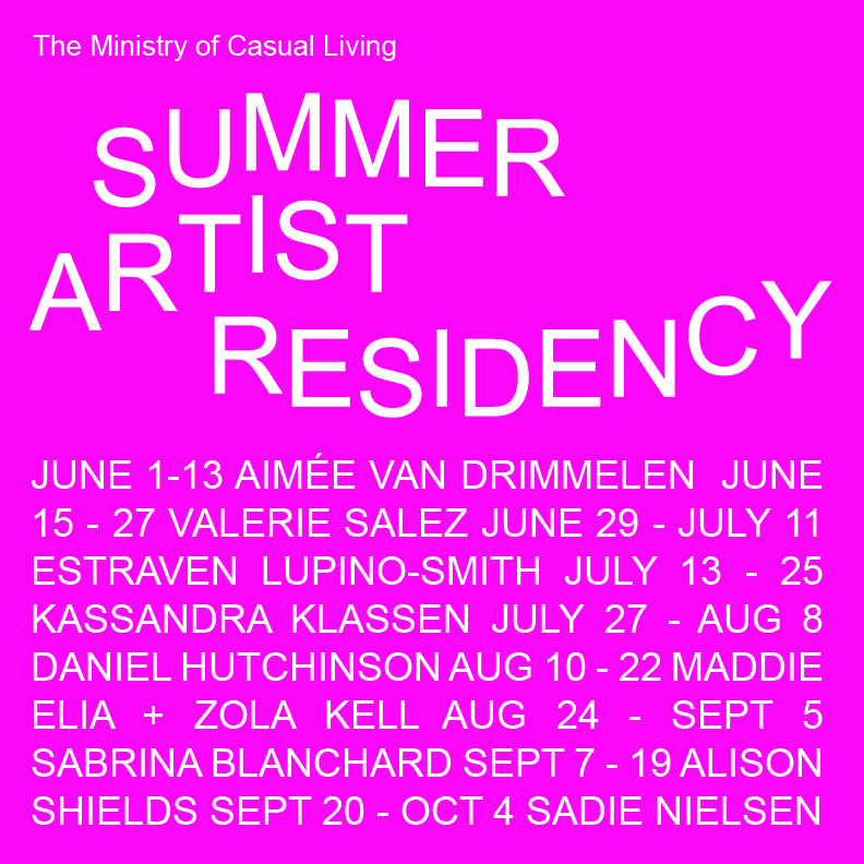 We are excited to announce the Ministry of Casual Living’s inaugural summer artist-in-residence. Throughout the summer, invited artists will work within the space for two weeks followed by an "open studio" where members of the public are invited to engage with the artists and check out their works in progress.