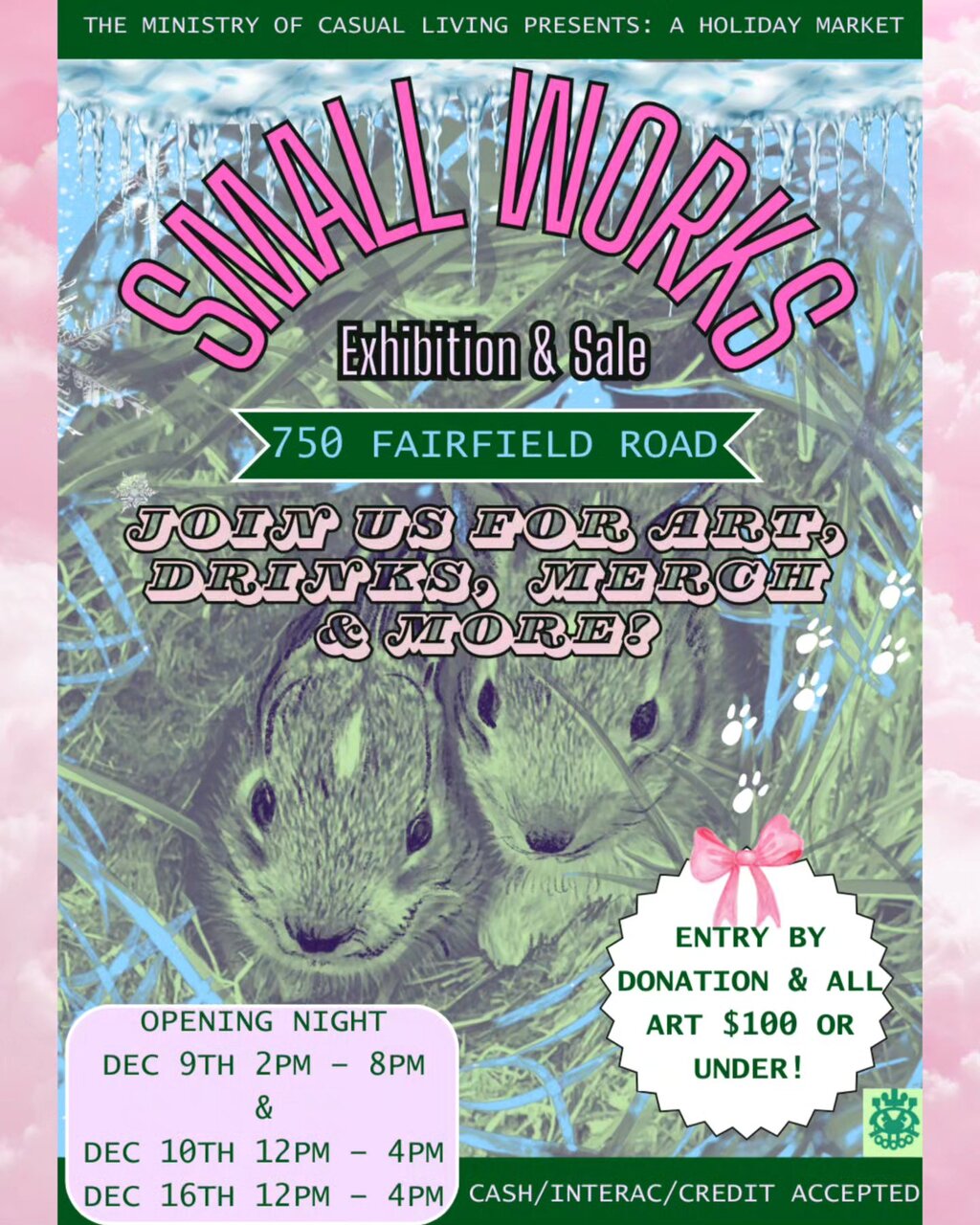 SMALL WORKS Sat. December 16th 2023 - Sat. December 9th 2023 @ The Ministry of Casual Living By Donation (All Ages) 2:00 - 4:00 doors at 12:00 Other Dates / Times Dec. 9, 2023 2:00 Dec. 10, 2023 2:00 doors at 12:00